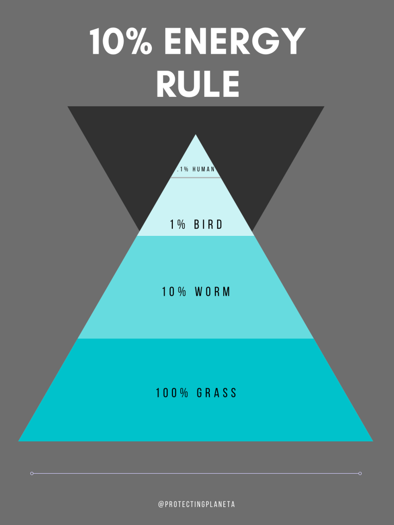 In ecology there’s this thing called the 10% rule. It describes how energy is lost as we move up the food chain. It’s not as much math as it sounds.