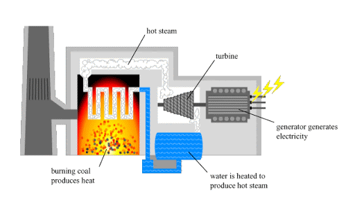 so we burn coal, oil, or natural gas (your classic icky sticky fossil fuels) to make heat, which heats up water, which turns into steam, which spins the turbine, which spins the generator, which makes electricity. here’s a diagram if that’s too much.